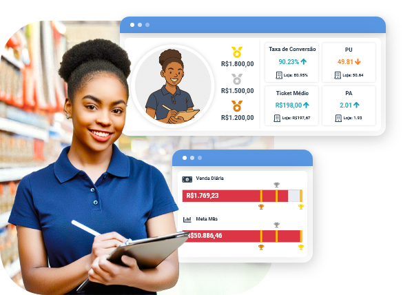 Transforme metas em desafios com recompensas tangíveis e acompanhe seu desempenho em tempo real, identificando oportunidades de melhoria de forma proativa.