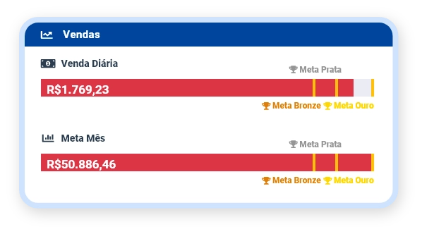 No card de Vendas, é possível acompanhar as vendas e compará-las com suas metas, podendo adicionar até 6 metas diferentes personalizáveis em nome e período.