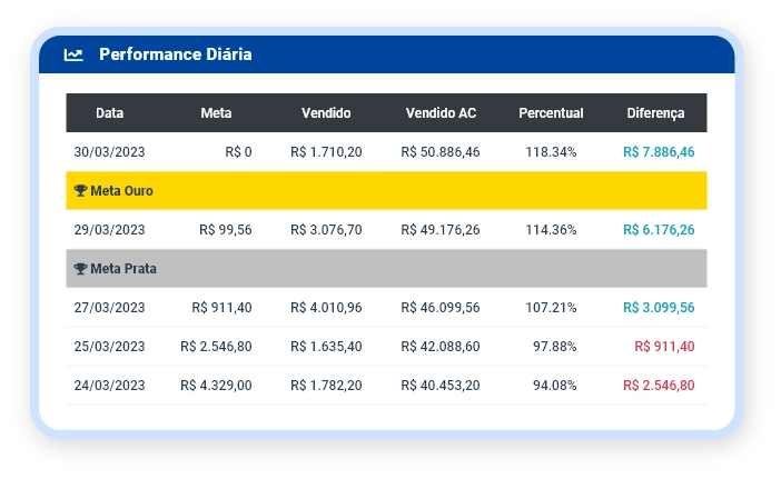 Em Performance Diária é possível ver de maneira detalhada as vendas diárias comparando-as com suas metas e o valor vendido acumulado.