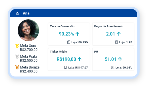 Em Minhas Metas, cada vendedor(a) consegue acompanhar suas metas, taxa de conversão, número de peças por atendimento, ticket médio e PU (Produto Único por Venda).