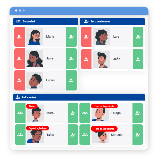 Ele classifica seus vendedores em categorias de disponibilidade, indicando quem está pronto para atender, quem está em atendimento e quem está temporariamente indisponível, possibilitando uma tomada de decisão mais ágil e informada.